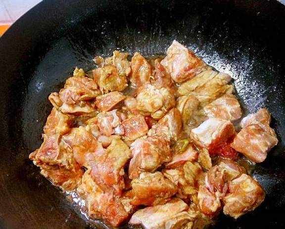 5然后放入排骨开始煸炒至上色入味!
