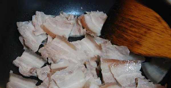 4、锅中倒入少许食用油,油热后放入猪腿肉开始翻炒。