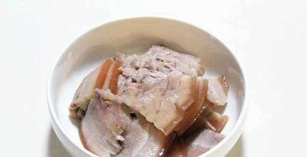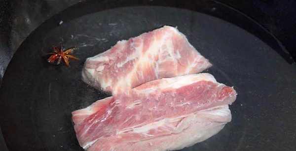 2、锅中倒入适量清水,然后将猪腿肉放入锅中,加入盐1勺,料酒2勺,大料1颗。大火烧开,转小火煮20分钟,直到筷子能把猪肉扎透。