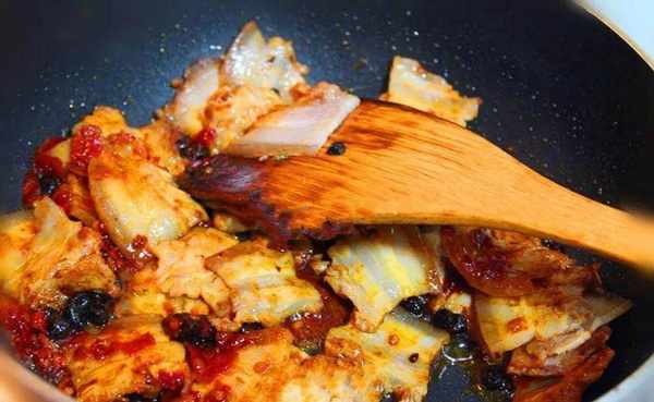 5、猪腿肉表面煎至微黄,再加入1勺豆豉和1勺郫县豆瓣酱,翻炒至红油出。然后加入葱、姜和蒜,炒香。