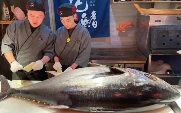 酒店的婚宴最初没有这道菜,因为酒店无法提供新鲜的金枪鱼。为此,新郎从欧洲买了5条野生蓝鳍金枪鱼,每条都有100多斤重。这条蓝鳍金枪鱼的价格极其昂贵,捕获后整条鱼被拍卖。一条100多猫重的金枪鱼,往往能拍出几十万。据说日本人最爱金枪鱼,所以那里的价格也比较贵,最贵的拍卖价超过3亿日元。