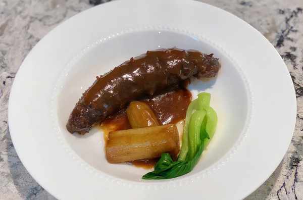 3.葱花海参辽宁海参,尤其是野生海参,被誉为中国海参中的极品。它们不仅味道好,而且营养价值最高。葱烧海参是山东鲁菜的菜谱,数量不限,每盘一个。据说酒店厨房做这道美食时,是按照新郎的意愿,将泡好的海参和老母鸡一起炖的。蘸上鸡汤,相当奢侈。