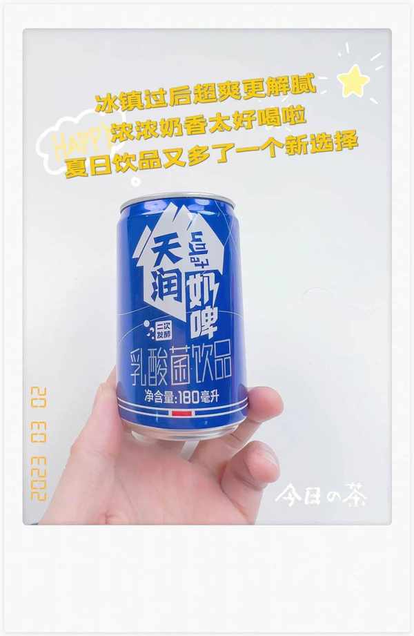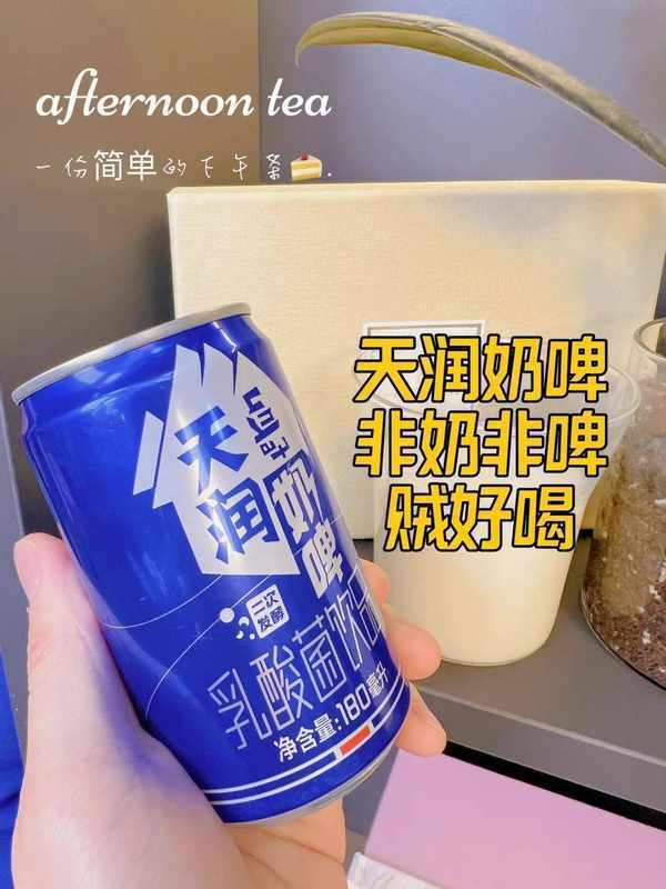 奶啤,是一种非活性乳酸菌饮料。是牛乳与乳酸菌发酵后,辅以酵母菌进行二次发酵。融合了牛奶的营养和啤酒的醇香于一体,含酵母菌自产的二氧化碳气体,并且天润奶啤不含有酒精,自带发酵的香气,给人一种奶不醉人,人自醉的畅快体验。