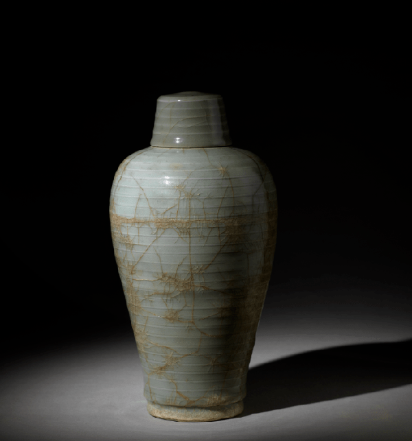 宋 龙泉窑青釉弦纹带盖梅瓶