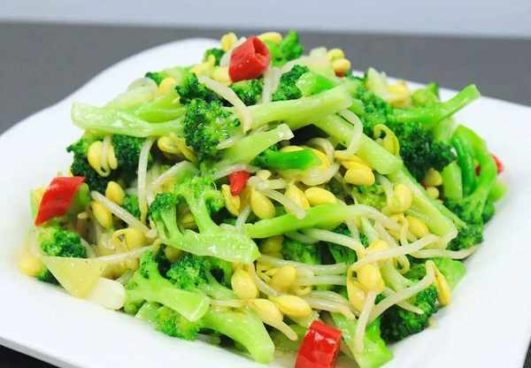 3.锅内烧油,倒入葱、姜、蒜、小米椒快速翻炒出香味,倒入黄豆芽继续翻炒,加入食盐2克、鸡粉2克、鸡汁2克翻炒化开,倒入西兰花再翻炒一会儿,勾入一点水淀粉能够使调料更好地融合在一起,淋入明油5克提亮色泽,快速翻炒几下就可以出锅了,美味即成。