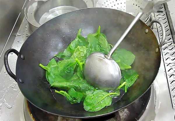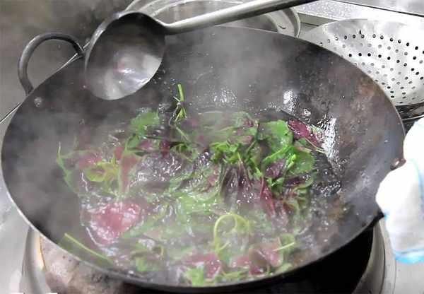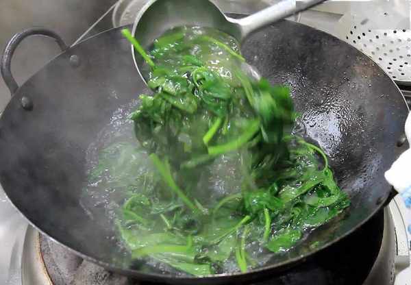 2.锅内烧水,加入一勺食盐入底味,淋入少许植物油,植物油能在红薯叶表面形成油膜,使红薯叶颜色更加翠绿,水烧开以后放入红薯叶,焯水50秒钟,把红薯叶倒出来,快速用凉水冲洗一下,凉水冲洗红薯叶吃起来有脆感、口感好。