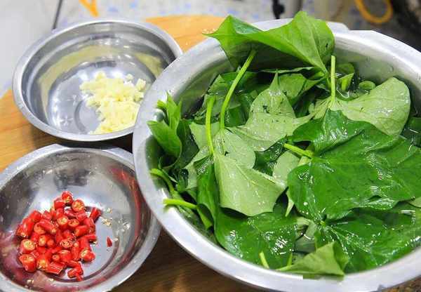 1.准备适量的红薯叶,放入清水中洗干净;准备几个小米椒切成辣椒圈,大蒜拍扁剁成碎末备用。