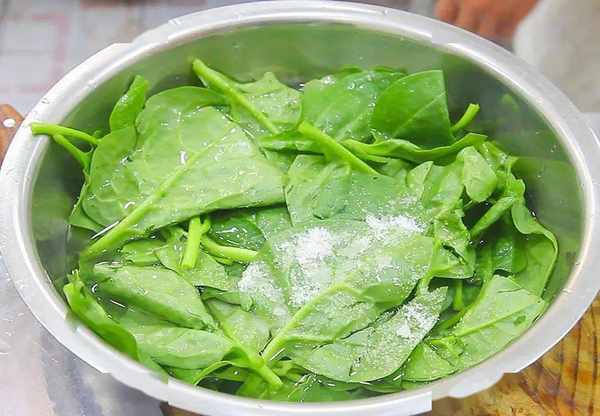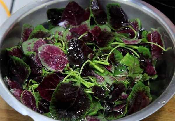 1.准备苋菜一把,去除根部放在盆中,倒入清水洗干净,放入食盐2克,可以有效减少苋菜的农药残留物。