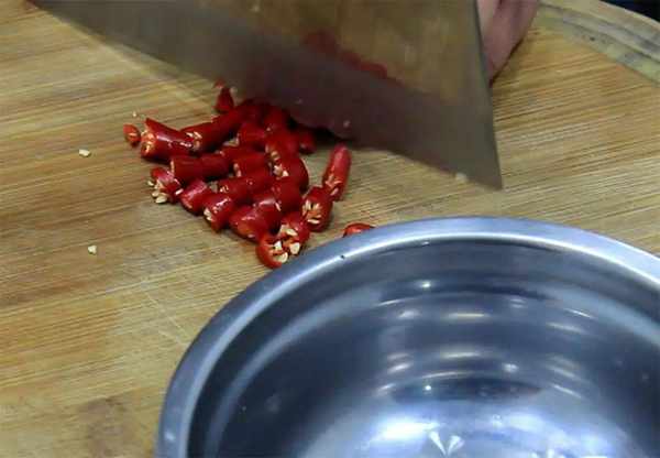 2.准备小米椒五个,切成辣椒圈。大蒜几粒放入蒜臼里面,捣成蒜泥备用。