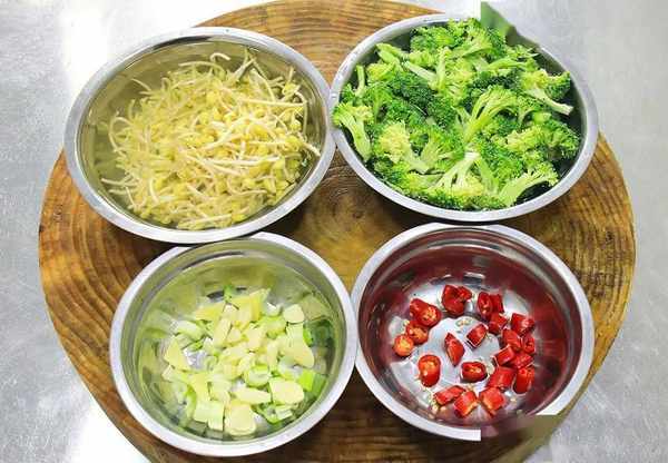 1.准备黄豆芽300克,用清水浸泡,捡出豆皮不要;西兰花一个,切成大小均匀的小朵放在盆中,加入清水浸泡,加入食盐2克,食盐可以有效地减少农药的残留;切点小米椒圈、葱花、姜片、蒜片备用。