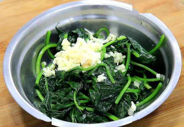 3.把红薯叶控过水分以后放入盆中,倒入蒜末,加入食盐2克 ,鸡粉2克,倒入芝麻香油5克,用筷子搅拌均匀。
