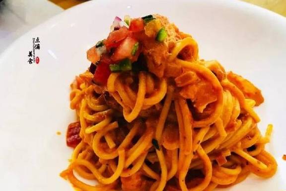 【番茄鸡肉意面】这个一定要点,也是吃下来觉得今天最好吃的菜了。意面煮的不错,不硬不烂,番茄味也可以,不会太浓,还有鸡肉是很大块的,嗯,这顿最大块的肉了。