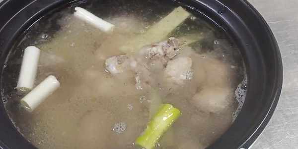 随后再将炒香的排骨放入砂锅中,加入适量的葱段和姜片去腥增香,随后再加入没过食材的温开水。加温开水。炖制出来汤更加的透白肥后,将排骨端至煲仔炉上,开大火将锅中的汤汁烧开,