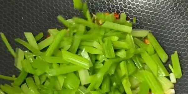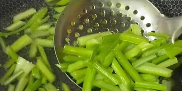 然后锅中烧水,加入一小勺盐,少许的食用油,水开下入芹菜焯烫十秒钟,这样能使芹菜更加翠绿,营养不流失,还能去除一部分草酸,吃起来会更放心。焯好以后捞出迅速放入冷水中投凉,这样能保持芹菜的清脆口感,颜色也不会变黄。