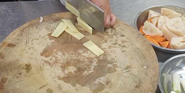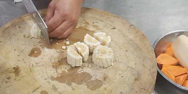 我们再来准备一些配菜,去皮之后的胡萝卜改造成滚刀块,然后再将洗净的玉米改刀成块,去皮之后的藕段也切成滚刀块。
