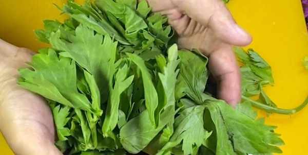 首先咱们把芹菜的根部切掉,然后把芹菜叶摘下来,这个芹菜叶啊,千万别扔,留着明天煎鸡蛋吃,那也是非常的好吃下饭。