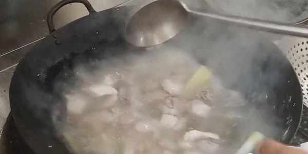 随后开大火将锅内的水分烧开,打掉表层的浮沫,浮沫清理干净之后,随后转小火再煮至两分钟左右,这样就可以将排骨中的血水清理干净。煮的差不多的时候,将排骨倒出控水,最后用清水再次将排骨清洗干净。