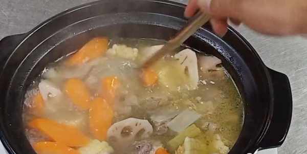 随后将表层的红沫打掉,再将刚刚切好的胡萝卜、藕、玉米全部倒入进来,再次煮开之后盖上盖子,然后用小火炖至40分钟,这里呢是炖至40分钟之后的排骨,