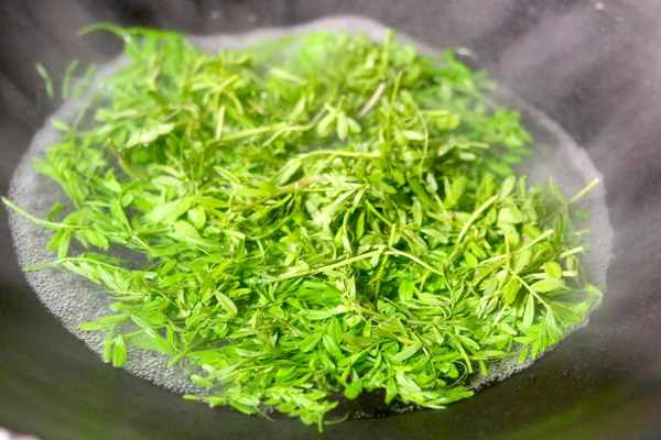 3、把焯水的蒲公英直接倒进去,然后进行快速的翻炒,把它炒香之后,放入少许的盐。
