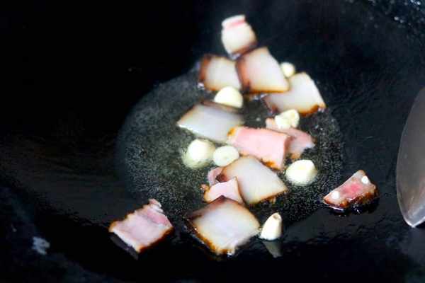 2、锅里放入植物油,把切好的腊肉放进去,我们简单的翻炒一下,让它的香味出来。