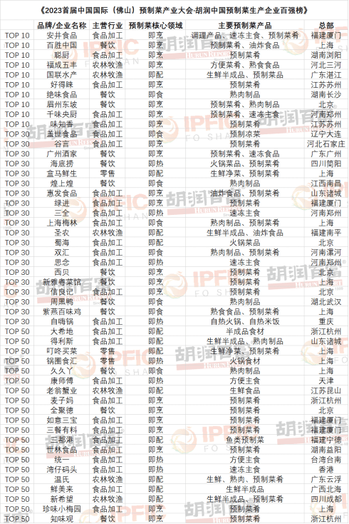 榜单列出了预制菜生产领域最具实力的中国百强企业,分为四个级别:10强、30强、50强和100强。
