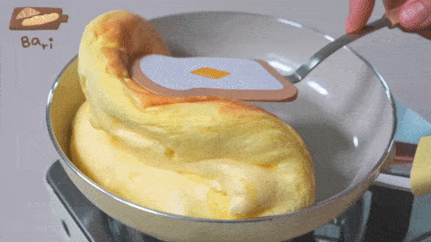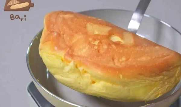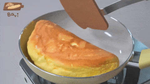 8、蛋糕发起来后小心的将它对折起来,轻轻按压定型在翻一个面煎2分钟左右出锅