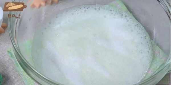 2、用打蛋器把蛋白打到呈鱼眼泡状的时候加入细砂糖