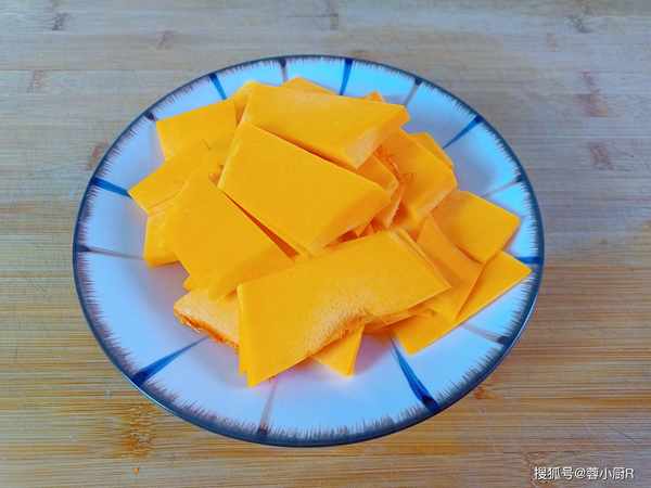 1、老南瓜200克,去皮后切片,接着装入盘中。