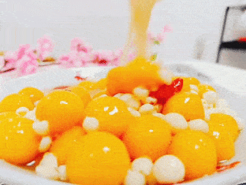 4、接着放1把桂花,1把枸杞再倒半碗淀粉水,搅拌均匀后继续煮2分钟,煮到汤汁变浓稠就可以关火出锅了。