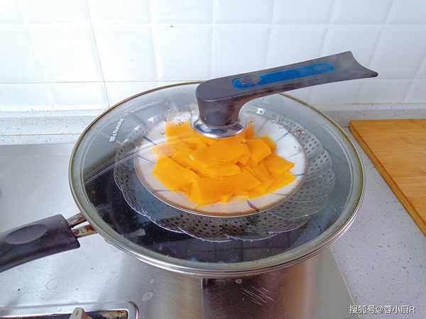 2、起锅烧水,水开放入南瓜上锅蒸,大火蒸15分钟,用筷子能轻松插透就熟了。