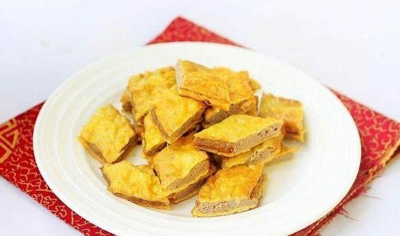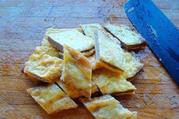 11、炸成金黄色捞起即可,一般需要回锅炸两遍,捞起沥油切成菱形