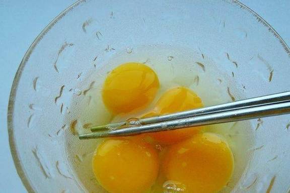 4、把4个鸡蛋加入少许盐和,搅打均匀,留点蛋液加少许水淀粉拌均
