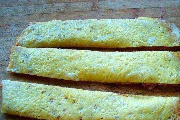 9、把夹沙肉饼切成长条(也可以切成菱形静置一会,让鸡蛋皮牛肉馅融合一起,这样好炸,这是我的经验,老传统的做法就是直接炸长条)