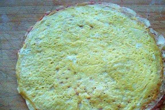 6、取出最好凉一会,这样好铺牛肉馅,把鸡蛋饼皮上,刷上一层鸡蛋淀粉糊,均匀的铺满牛肉馅