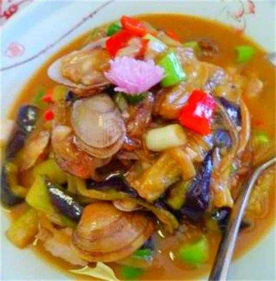 石锅茄子炖蚬子,茄子粘糯,加上蚬子的鲜味,很下饭。