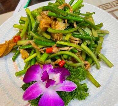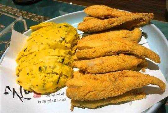 苔菜小黄花,据说是该店的招牌菜,小黄鱼经过腌制,用海苔菜挂糊,油炸后吃起来海苔菜的味道和小黄花鱼的鲜嫩融为一体,味道鲜甜。