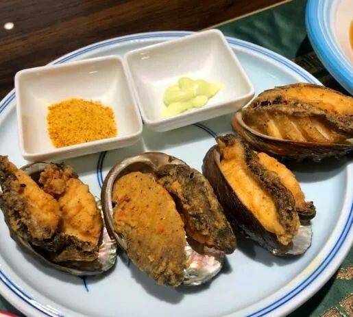 炸鲍鱼片,挂糊炸过的鲍鱼还是放在鲍鱼壳内,搭配了两种蘸料,一种芥末沙拉酱,一种椒盐,外酥里嫩的。