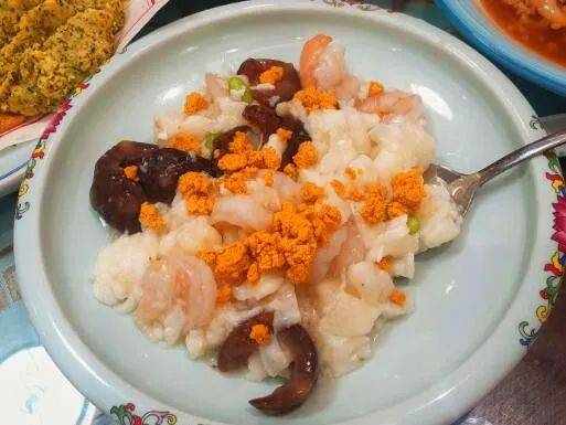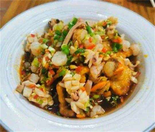 口水海鲜肉,在红油肉的基础上加入虾仁、鱿鱼,酸酸甜甜带着微微的辣。