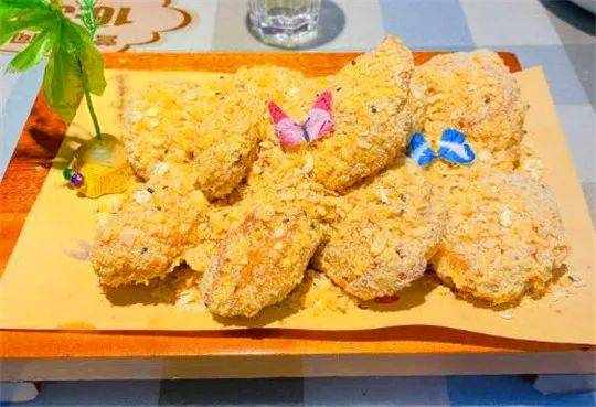 榴莲盒子,是茄子盒里有榴莲榴莲肉,外面裹上麦片,还挺好吃。
