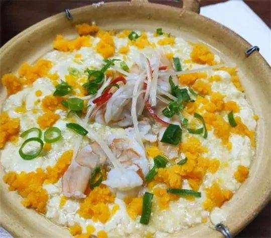 蛋黄鲜虾鲜豆腐,颜色特别鲜艳,豆腐糯糯,蛋黄很香,上面撒了虾丁。