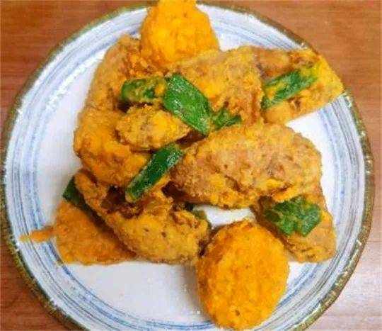 金沙鸡翅,不仅有鸡翅还有玉米段,外面都包裹一层厚厚的沙沙咸蛋黄,好吃到吮手指。