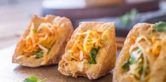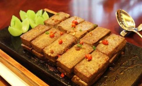 做法:1.老豆腐切成三角形,入油锅炸至表面金黄。