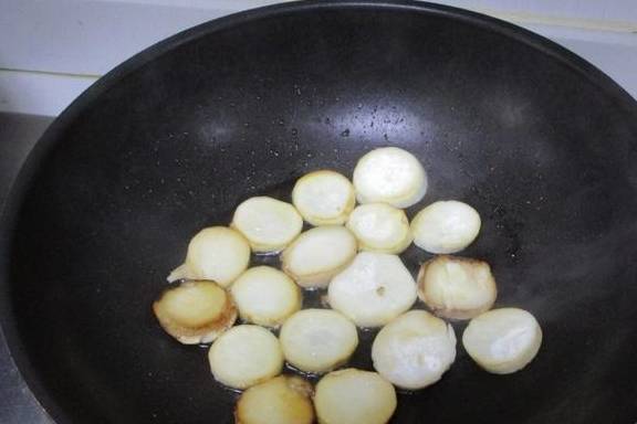 热锅倒油温油逐片下入杏鲍菇简直两面变微黄后捞起