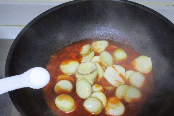 留底油下入番茄酱再加入少许清水炒出香味后把杏鲍菇回锅加入盐调味