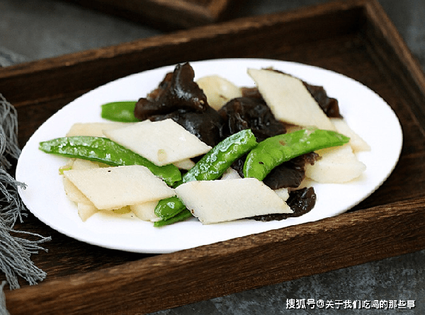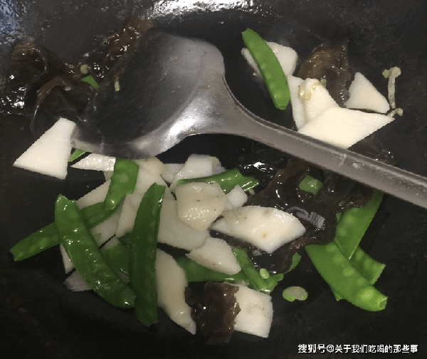 3、起锅烧油,放入葱花爆香,倒入荷兰豆大火翻炒2分钟,断生后倒入木耳、山药,大火翻炒1分钟,加入适量食盐、鸡精调味,炒匀后即可出锅。