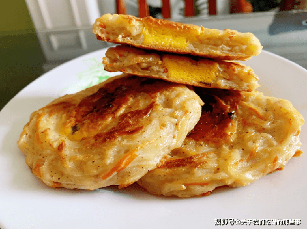 2、平底锅倒入适量油,舀一勺土豆丝放入锅中,用铲子整理成圆饼状,小火煎2分钟,定型后翻个面,继续煎一会儿,等到两面金黄过后即可出锅。