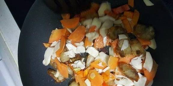 9.加入焯好的胡萝卜、杏鲍菇,煸炒一下,加入盐,入味即可出锅