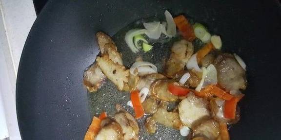 8.加入葱花、红辣椒煸炒一下