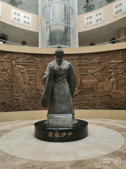 走进博物馆一楼大厅,被餐饮界奉为“鼻祖”的伊尹雕像矗立在记者眼前。雕像后面的浮雕墙上展示了他在烹饪界取得的成就。因创立了“五味调和”等烹饪理论,他被后世人民尊崇为中国“烹饪始祖”。