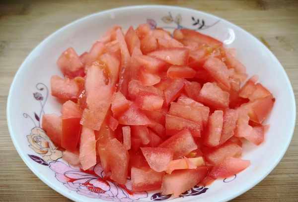 2、西红柿清洗干净,用十字刀切开西红柿的顶部,放入沸水中煮2分钟,捞出,去皮切成小片,装盘待用。